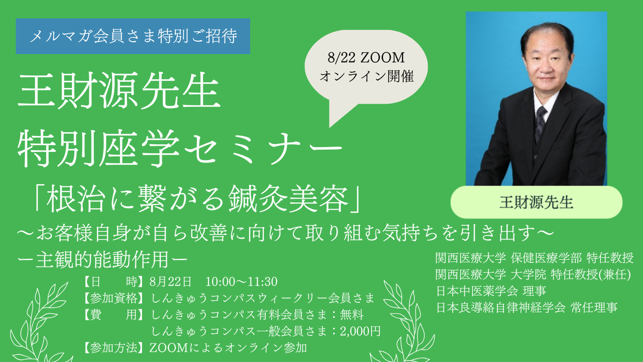 このたびカリスタ株式会社では社内勉強会として、関西医療大学 保健医療学部 特任教授/関西医療大学 大学院 特任教授(兼任)の王財源先生をお招きして、8/22(金)に特別座学セミナーを行っていただくことになりました。(現在、王先生には弊社カリスタにて教育、技術指導を行っていただいています)
